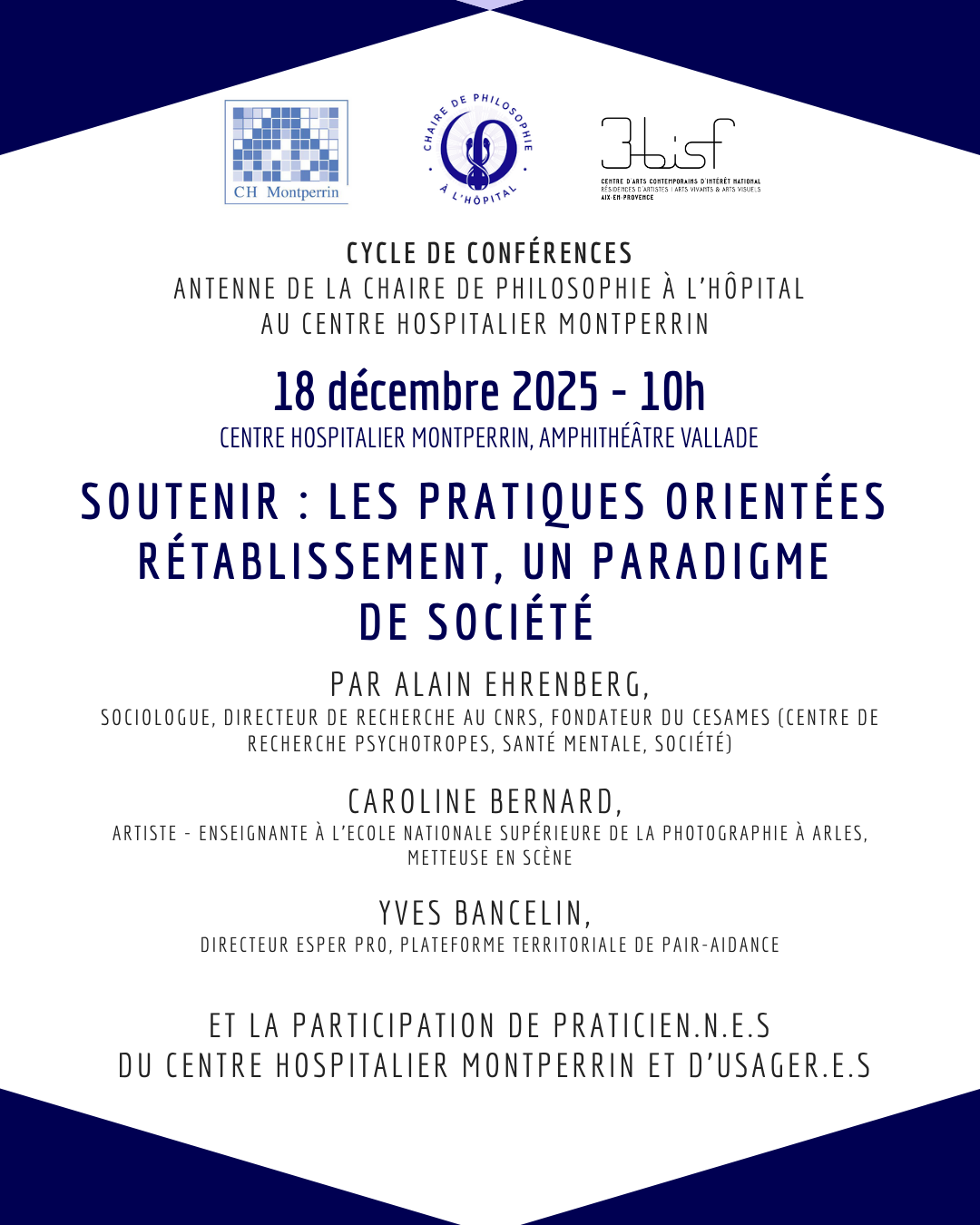 Le Centre Hospitalier Montperrin organise le jeudi 18 décembre 2025, de 10h à 12h, la troisième conférence du cycle de la Chaire de Philosophie à l’Hôpital : « Soutenir : les pratiques orientées rétablissement, un paradigme de société ».